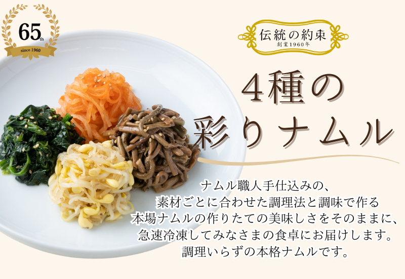福島・白河の自社工場で製造しているナムル。 製造からパック詰めまで全てナムル職人が手作業で行い、素材の味を大切に、それぞれの素材に合わせた調理法と素材をいかした調味で作られた本格ナムル。 大根、ぜんまい、もやし、ほうれん草の人気4種ナムルを、美味しさをそのままに急速冷凍しみなさまの食卓にお届けします。